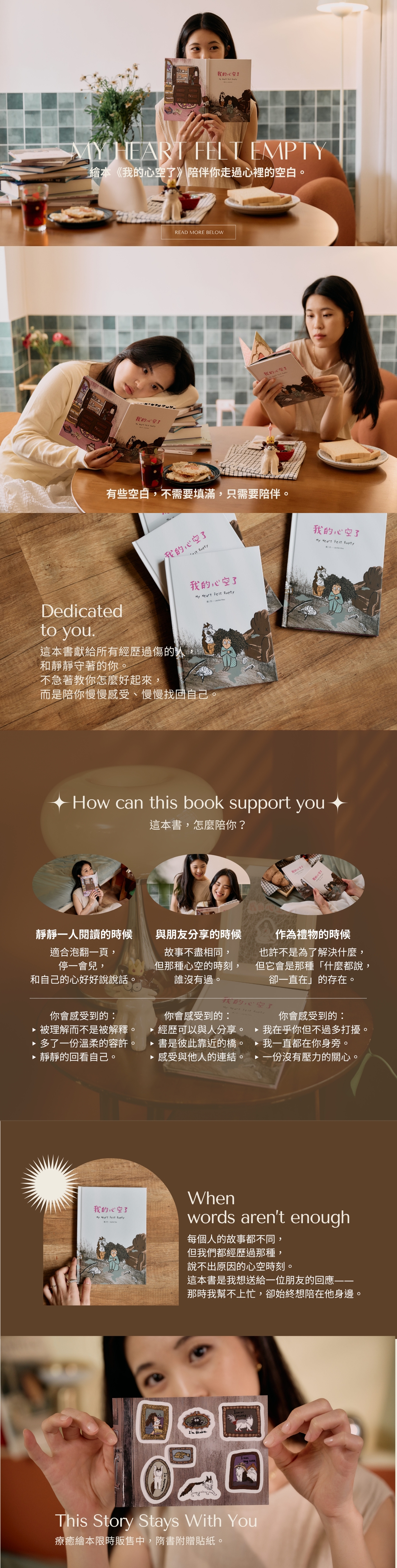 《我的心空了》是一本成人療癒繪本,<br>這本書獻給所有經歷過傷的人,<br>也送給那些只是靜靜陪伴,卻說不出安慰的你。<br><br>透過簡單的文字與溫柔插畫,感受當下生活的善意。不急著讓你好起來,而是陪你慢慢感受、慢慢重建自己。<br>有時候,心空了,才有空間讓光照進來。<br>願這本書,也陪你一起找回那顆完整的心。<br><br>優惠資訊<br>・五月享 85折免運優惠。<br>・每筆訂單皆附贈手繪貼紙組。